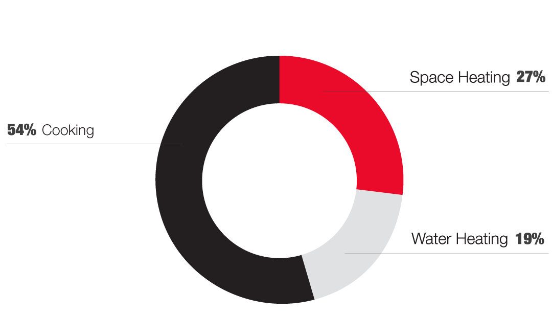 The following pie charts illustrate what restaurant activities use the most energy and cost the most. Cooking and refrigeration account for a large fraction of energy use in restaurants. Electricity end uses include (from the top, counterclockwise): 7% miscellaneous, 1% computing, 2% office equipment, 39% refrigeration, 22% cooking, 6% lighting, 1% water heating, 12% ventilation, 7% space cooling and 1% space heating. Natural gas end uses include (from the top, counterclockwise): 54% cooking, 19% water heating and 27% space heating.